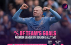 哈兰德本赛季进球数占曼城全队64.7%,若维持住将破英超纪录